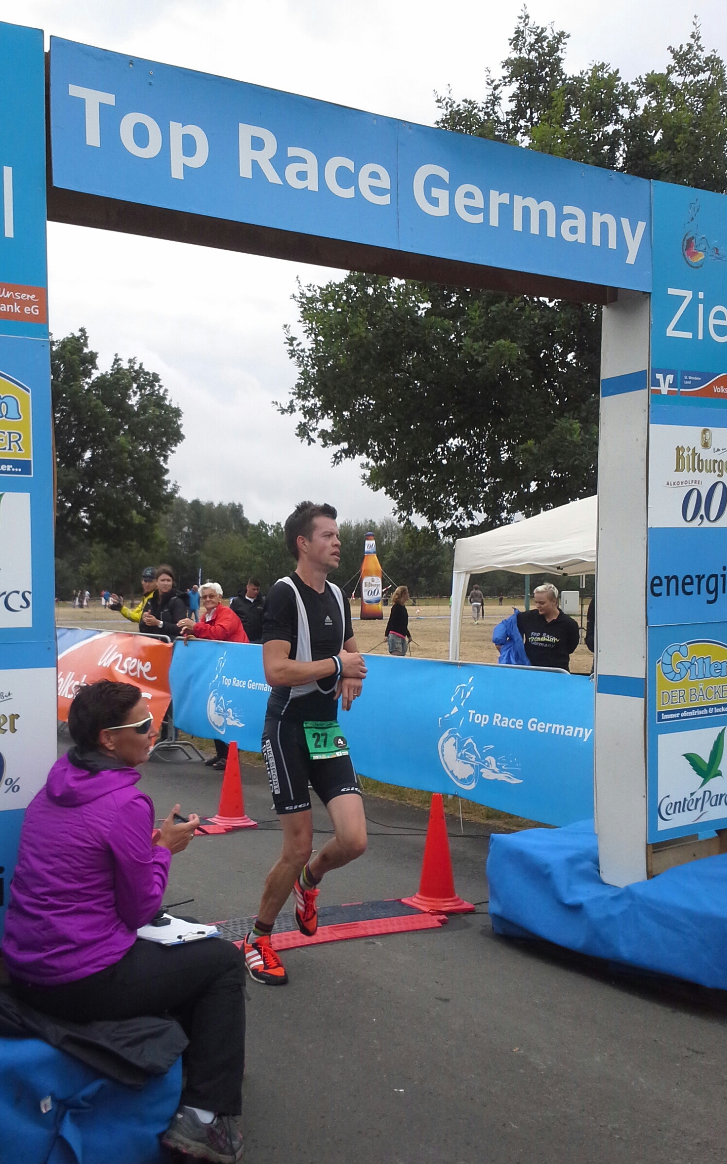Nach der Bronzemedaille bei den Saarlandmeisterschaften im Sprint Triathlon hatte Benny Irsch nun eine weitere Medaille im Fokus. Beim Top Race Germandy in Bosen, bei dem die Mitteldistanz über 1,9 km Schwimmen, 75 km Radfahren und 21 km Laufen den Saarlandmeisterschaften angehörte, musste Benny sich auf seine Paradedisziplinen Radfahren und Laufen verlassen um in die Medaillenränge zu fahren. Nach 40 Minute Schwimmen kam er als einer der letzten aus dem Wasser. Auf dem Rad und beim Laufen startete er eine furiose Aufholjagd und beendete das Rennen unter 51 Teilnehmern auf dem 8 Platz. In seiner Altersklasse M30 gewann er zudem die Goldmedaille der Saarlandmeisterschaften.